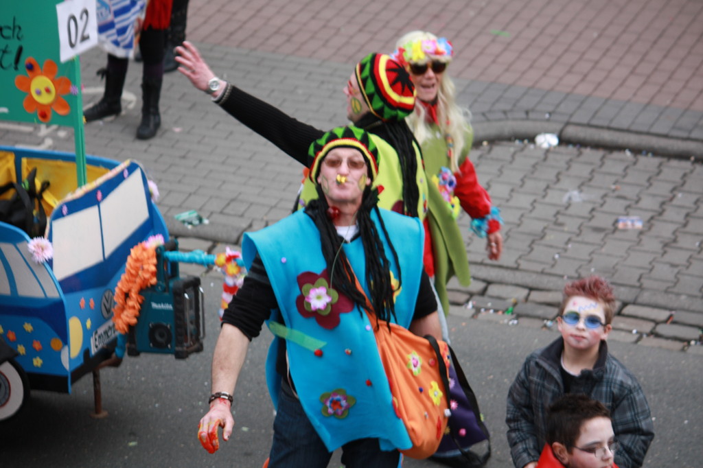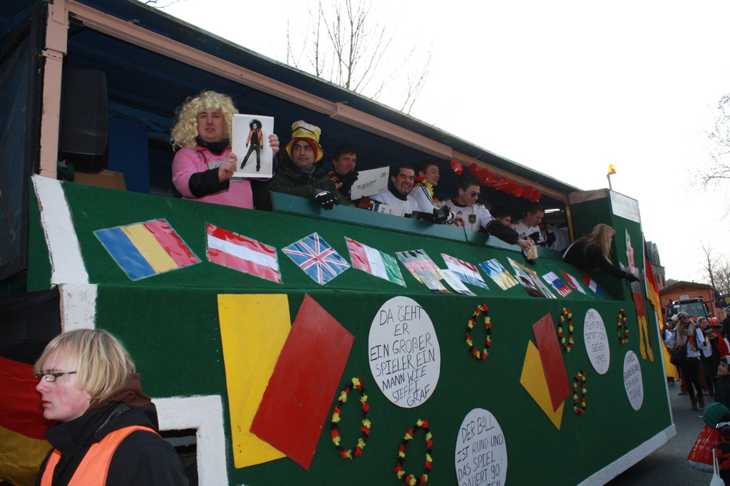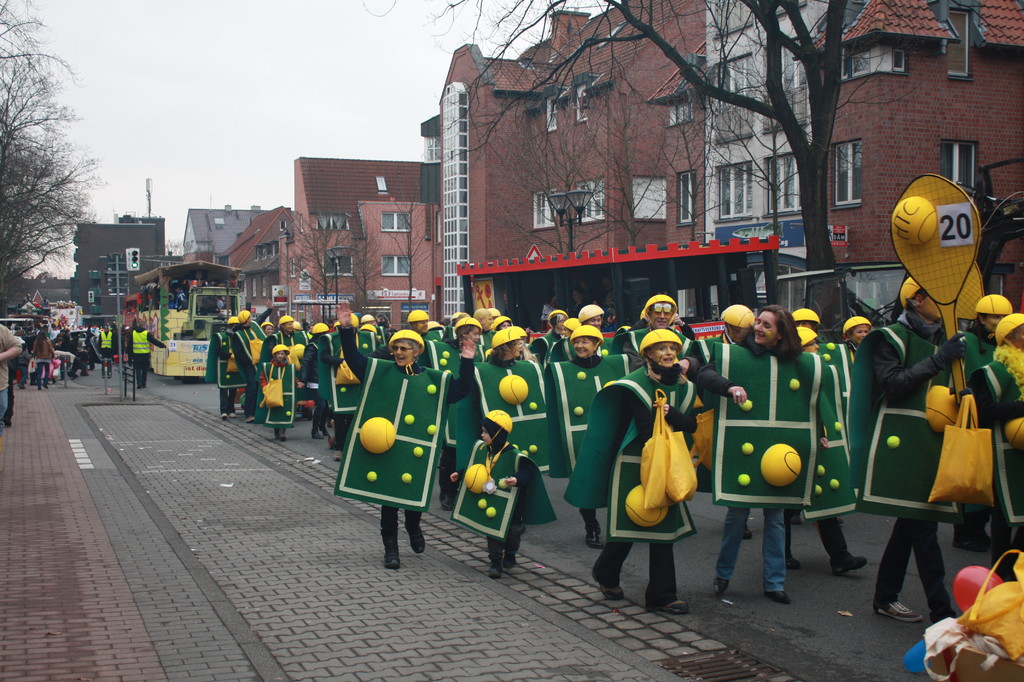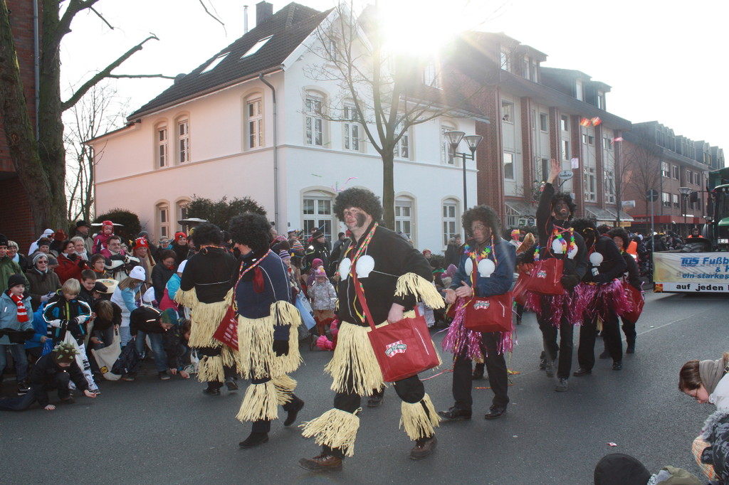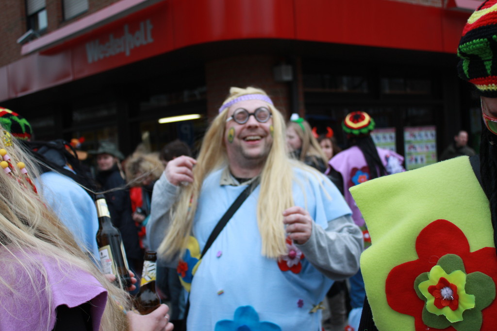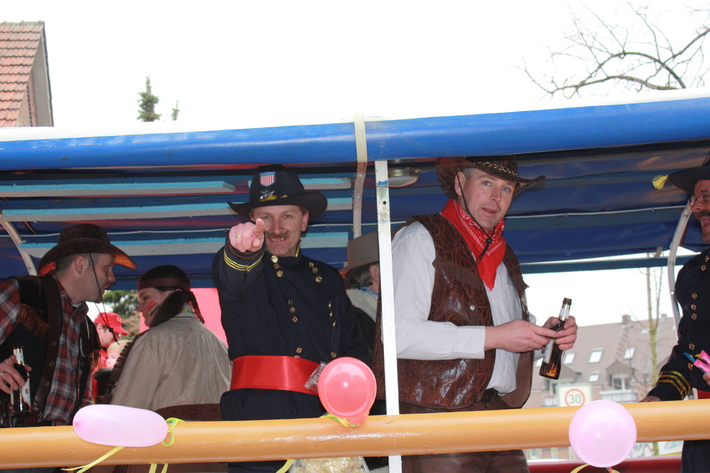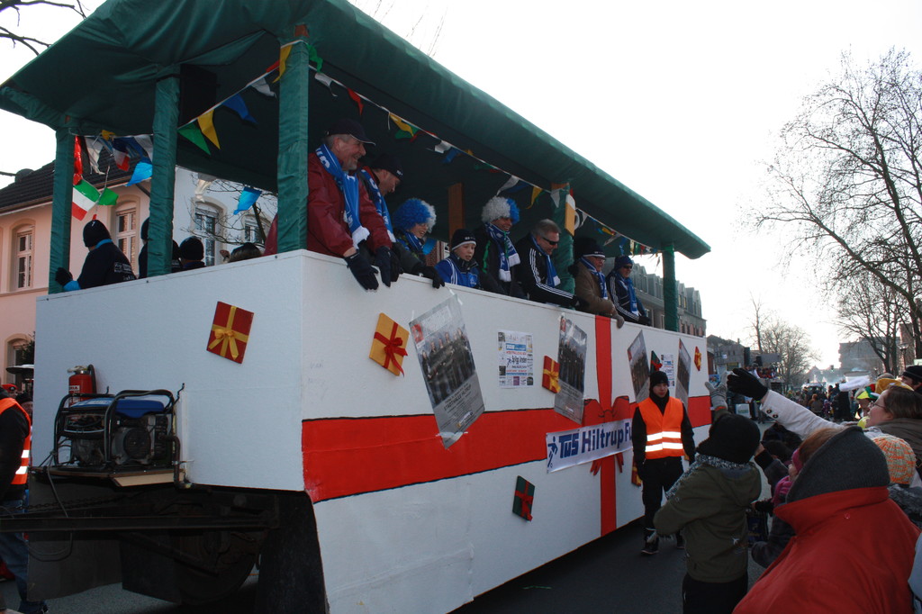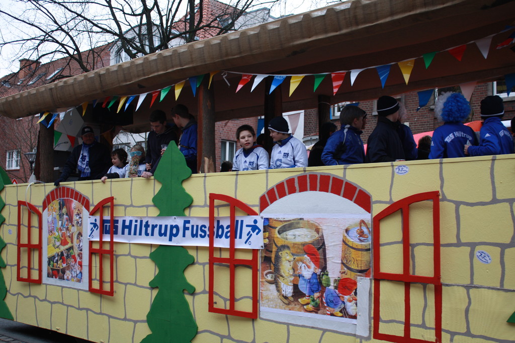 Es fanden sich sogar ein paar "Nichtkarnevalisten". Aber es war alles mehr oder weniger halbherzig. Bis das unsere Frauen zu Ohren bekamen. Da wurde mal wieder klar, wer "Herr im Haus ist". Es wurde geredet, telefoniert, geplant und getagt. Schließlich waren es ca 20 Personen die sich ein Kostüm angezogen und einen Bollerwagen geschmückt hatten. Mit Unterstützung der Vereinskasse und einem eigenen Startgeld wurde Wurfmaterial besorgt. Dann war der große Tag gekommen. Treffen war auf dem Schulhof an der Stadthalle. Die Stimmung war super, das Wetter trocken und die Kostüme bunt gewürfelt. Dann kam der Startschuß und es begann ein fantastischer Umzug durch Hiltrup. Schon nach den ersten metern auf der Marktallee stand für die meisten fest: Wir sind im nächsten Jahr wieder dabei.