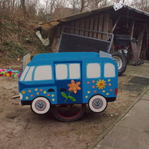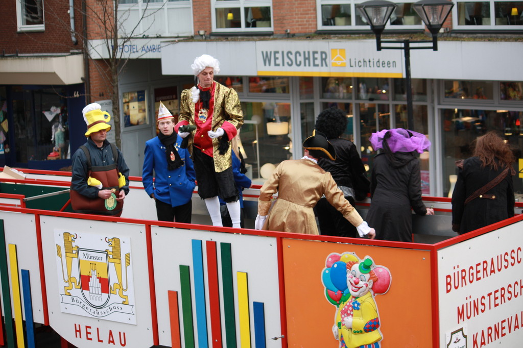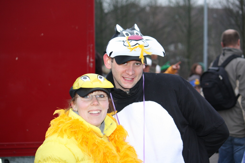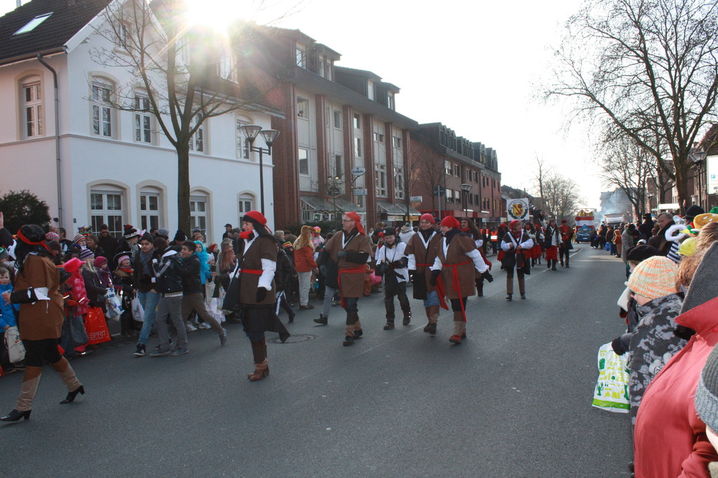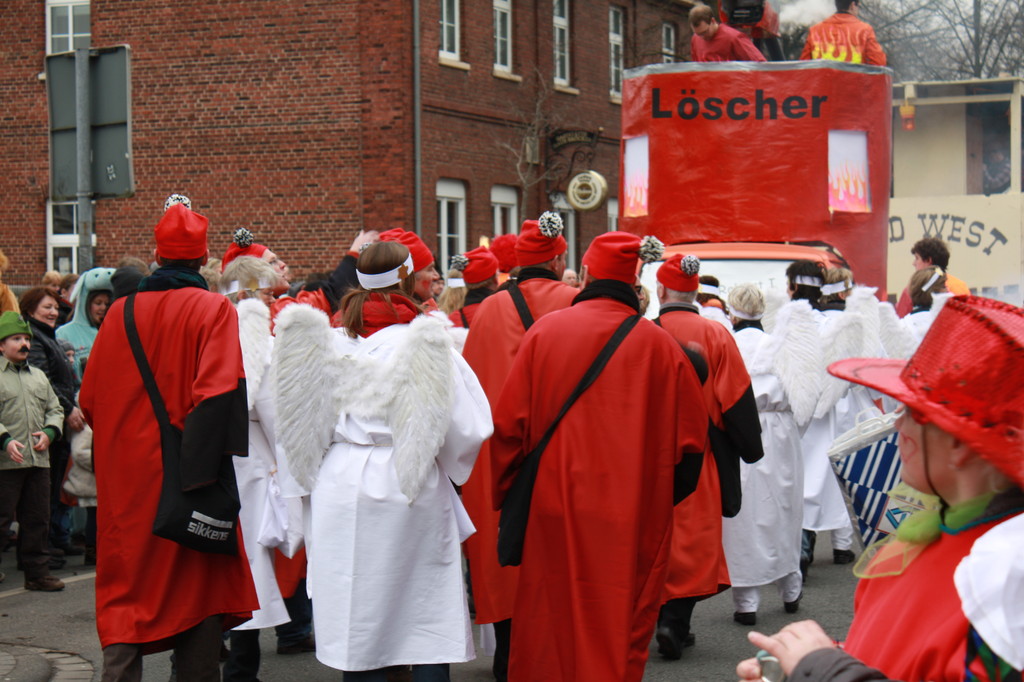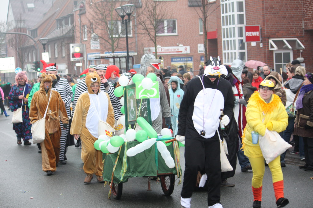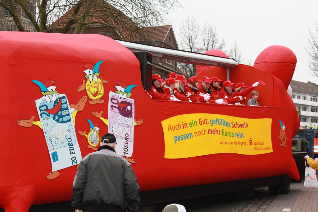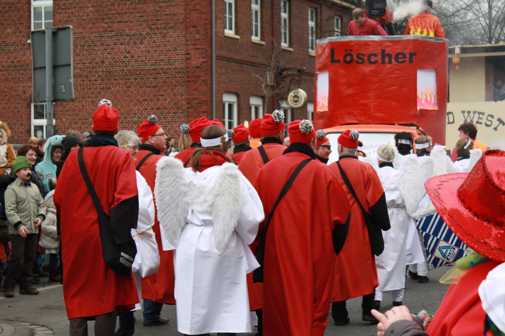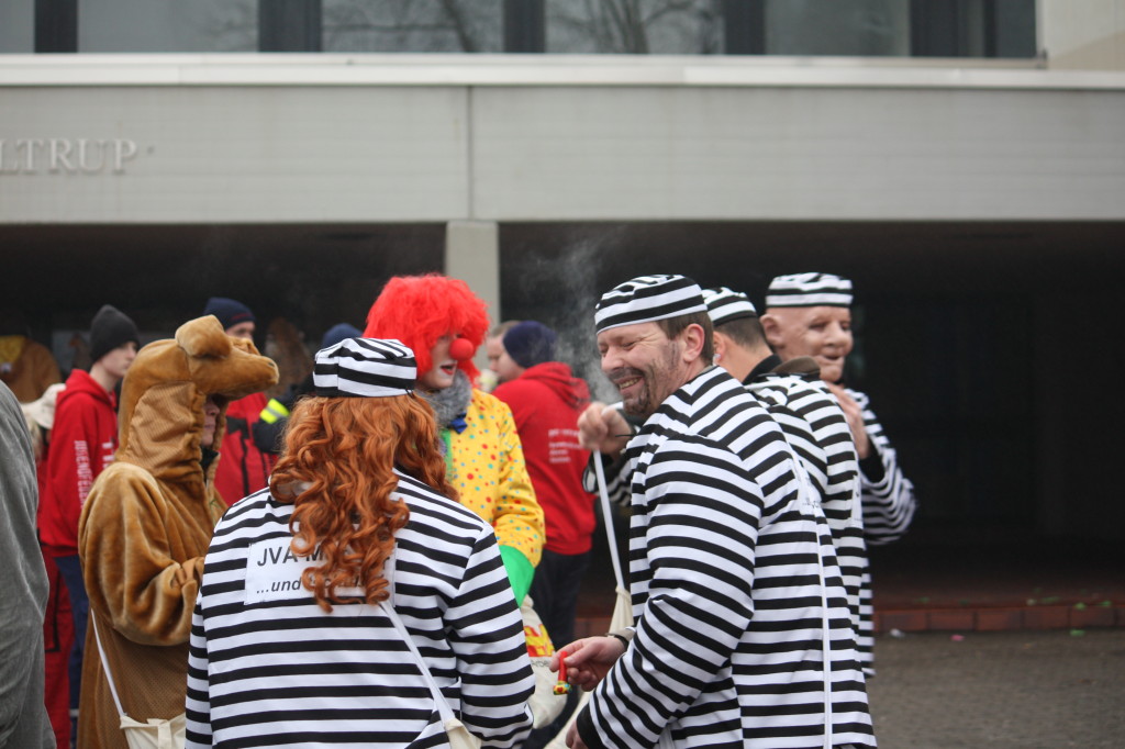 Es fanden sich sogar ein paar "Nichtkarnevalisten". Aber es war alles mehr oder weniger halbherzig. Bis das unsere Frauen zu Ohren bekamen. Da wurde mal wieder klar, wer "Herr im Haus ist". Es wurde geredet, telefoniert, geplant und getagt. Schließlich waren es ca 20 Personen die sich ein Kostüm angezogen und einen Bollerwagen geschmückt hatten. Mit Unterstützung der Vereinskasse und einem eigenen Startgeld wurde Wurfmaterial besorgt. Dann war der große Tag gekommen. Treffen war auf dem Schulhof an der Stadthalle. Die Stimmung war super, das Wetter trocken und die Kostüme bunt gewürfelt. Dann kam der Startschuß und es begann ein fantastischer Umzug durch Hiltrup. Schon nach den ersten metern auf der Marktallee stand für die meisten fest: Wir sind im nächsten Jahr wieder dabei.